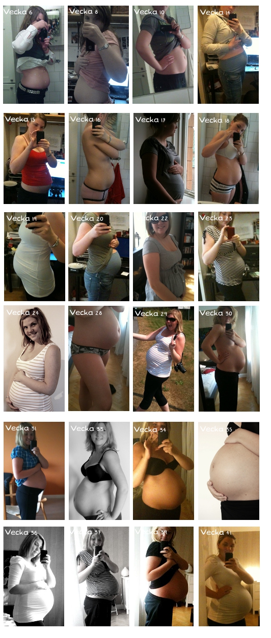 Satt och tittade igenom gamla bilder och hittade kollaget på magen. Det händer faktiskt att jag saknar den där stora kulan även fast jag i slutet självklart tyckte det var sjukt jobbigt och att jag inte förstod alls hur jag skulle kunna komma att sakna den. Men här sitter jag och saknar magen. Men jag ju självklart fått världens bästa grabb så trots den jobbiga väntan var det ju värt det!! Inatt vaknade han konstig nog mitt i natten och vägrade somna om, det har inte hänt på väldigt länge. Det slutade med att jag fick vagga honom till sömns i min famn i soffan. Han somnade där, på min mage. Och jag fick snosa lite bebis. Bästa som finns. Nu börjar faktiskt kroppen ställa in sig på att bli redo för ett till barn det märks. Kvinnliga hormoner och allt det där säkert. Men än är inte psyket redo. Det dröjer nog några år :)